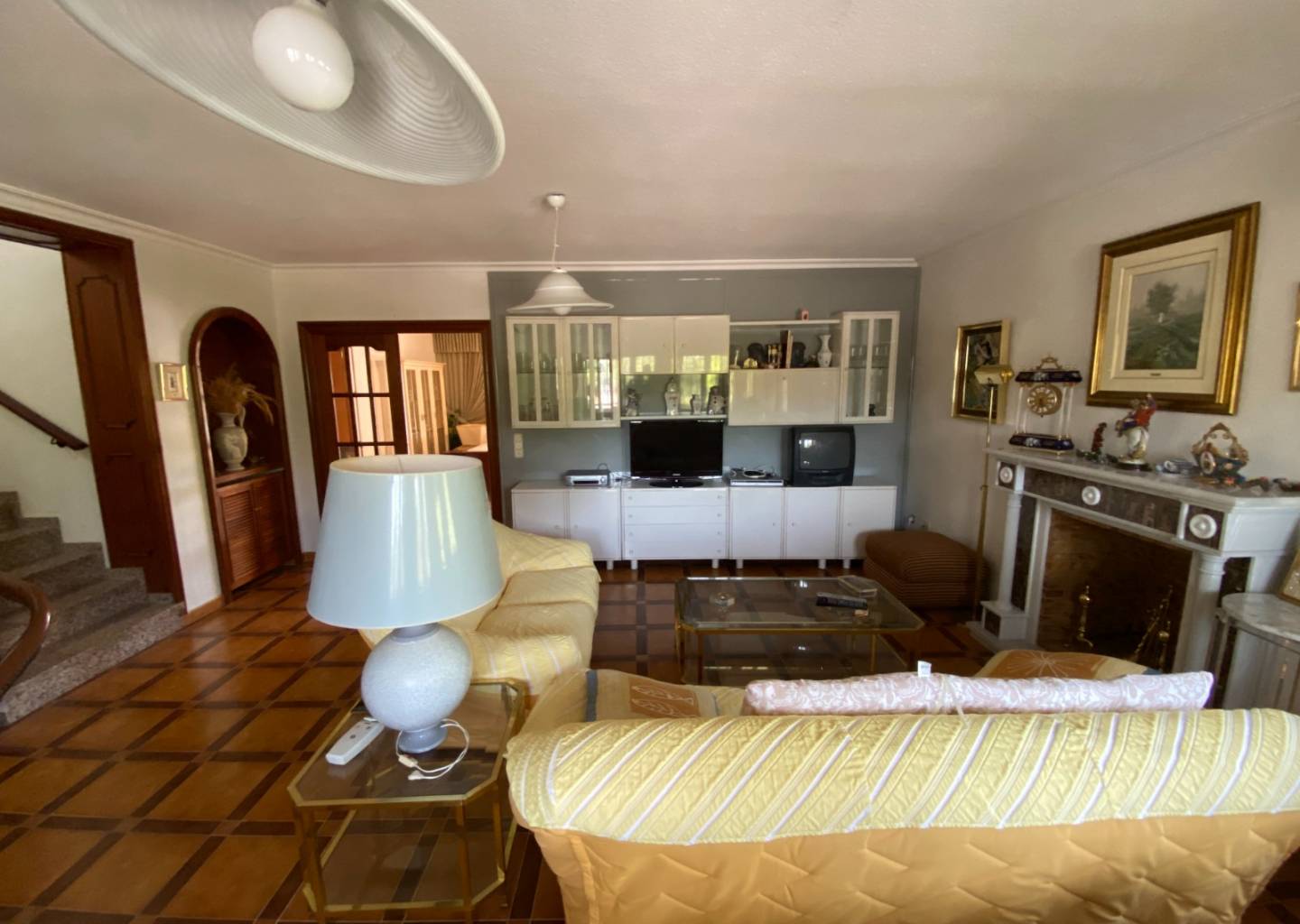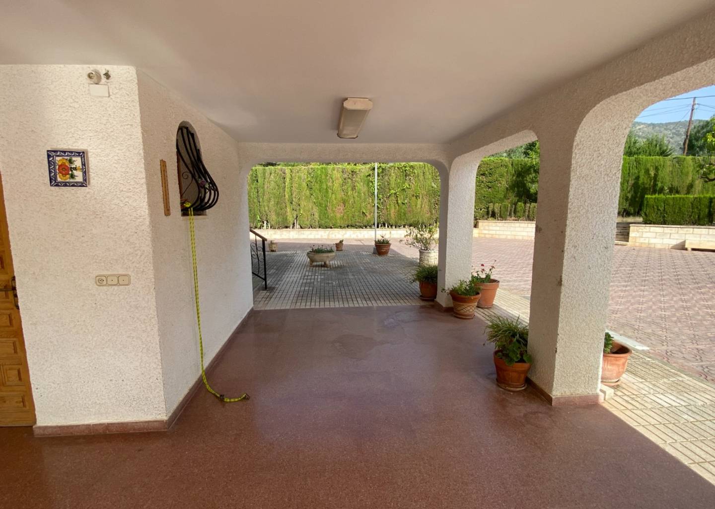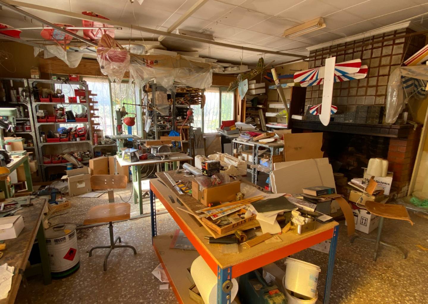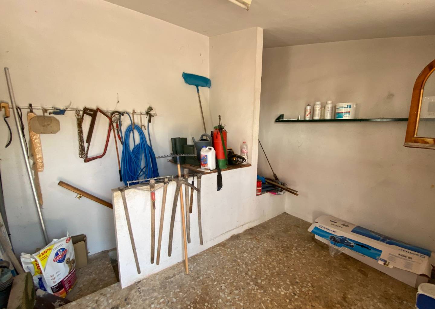 Si continuamos por el jardín, a la parte trasera de la piscina hay una casa de invitados con salón con chimenea, cocina y baño, aunque actualmente se está utilizando como taller para el hobby del propietario. Seguimos por la parte trasera de esta casita, que llegaría a la parte trasera de la casa principal, donde encontramos una cochera abierta con capacidad para varios coches y un trastero donde se encuentra la caldera de gasoil para la casa.