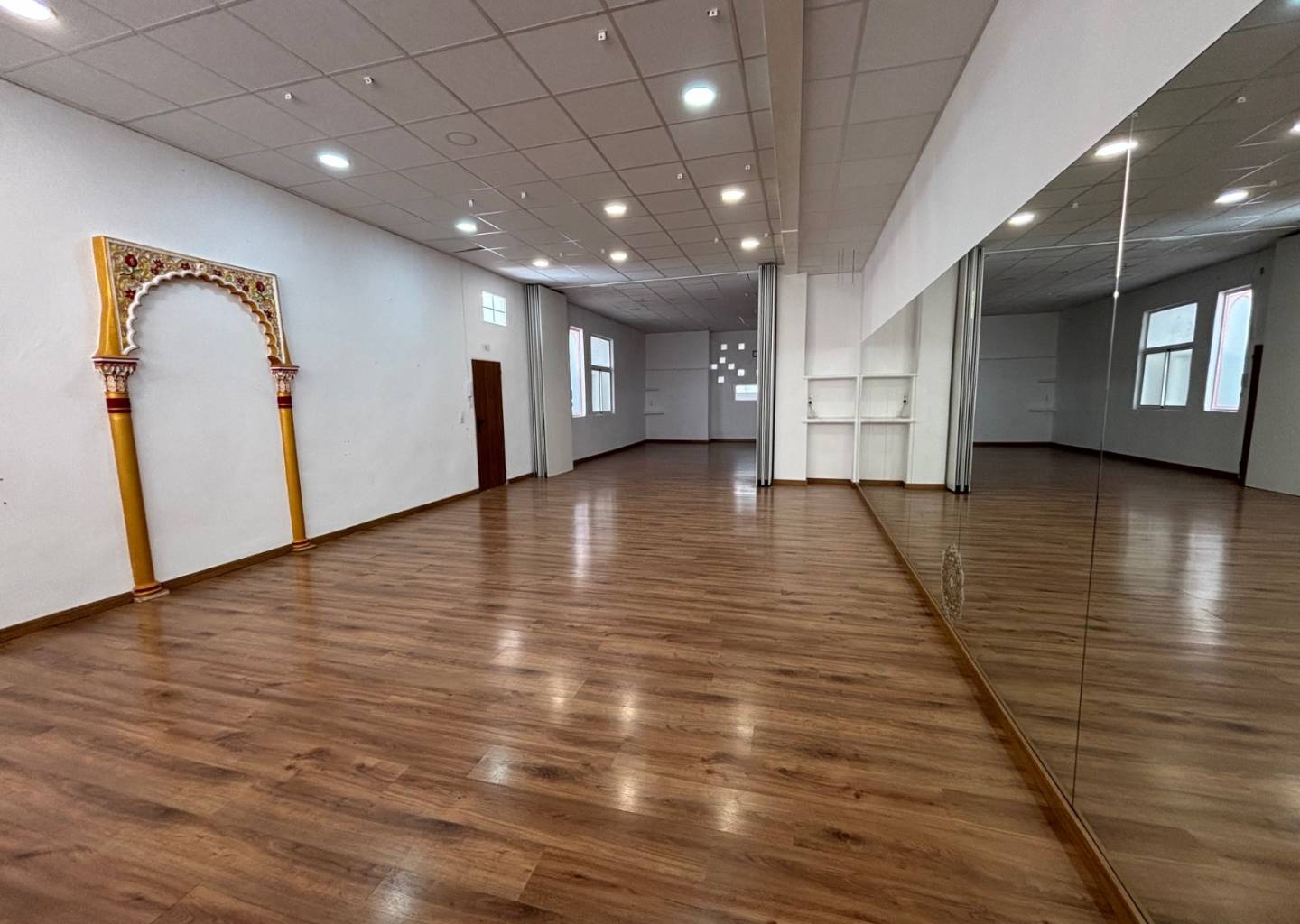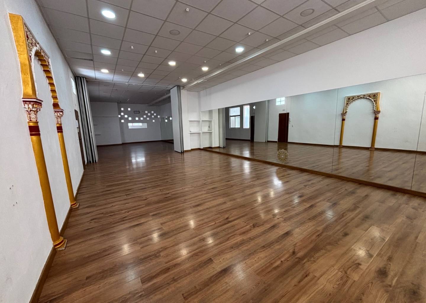 Cuenta con un enorme estudio de danza insonorizado con puertas divisorias que permiten crear dos estudios de generosas dimensiones, e incluso las divisiones están insonorizadas.