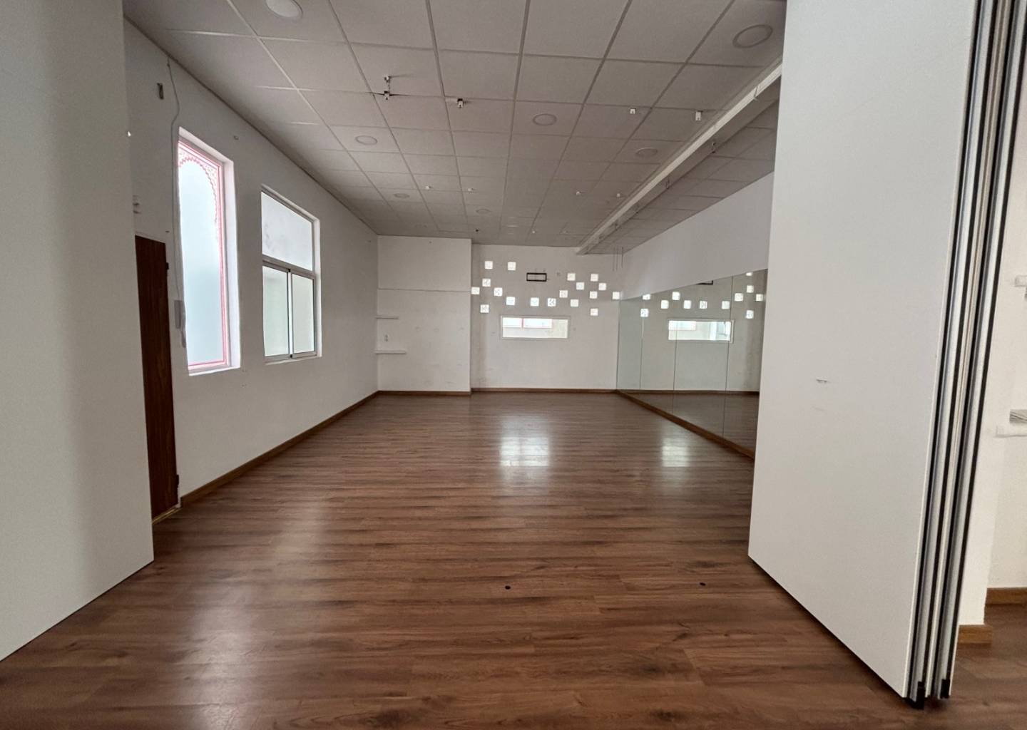 Dispone de vestuarios para hombres y mujeres, baños para hombres y mujeres, dos salas de espera/recepción y otra sala más grande que podría utilizarse como tercer aula de danza.