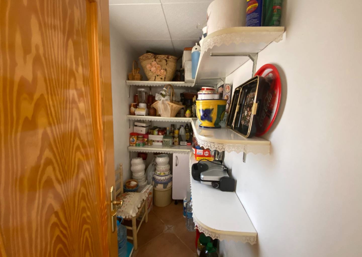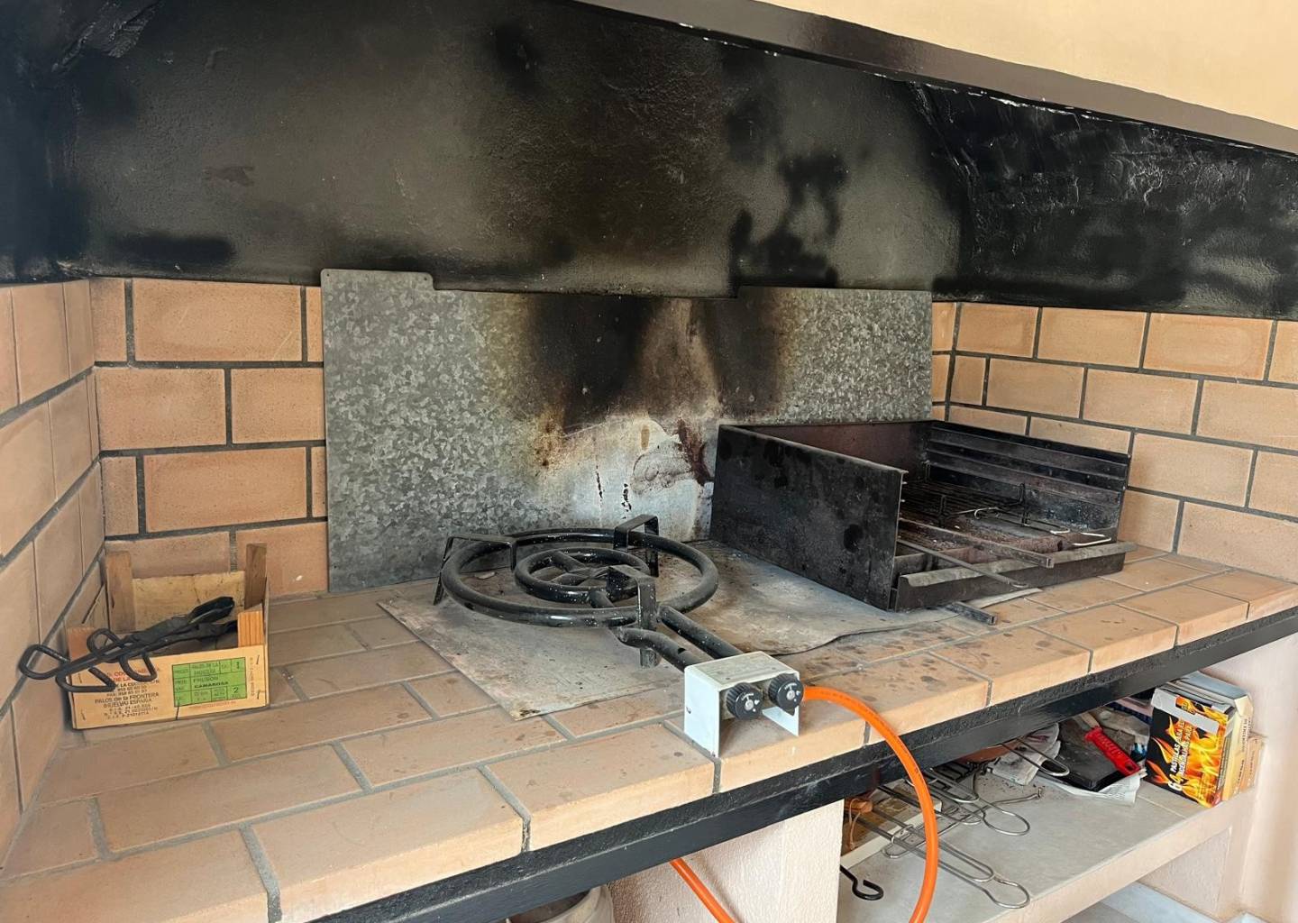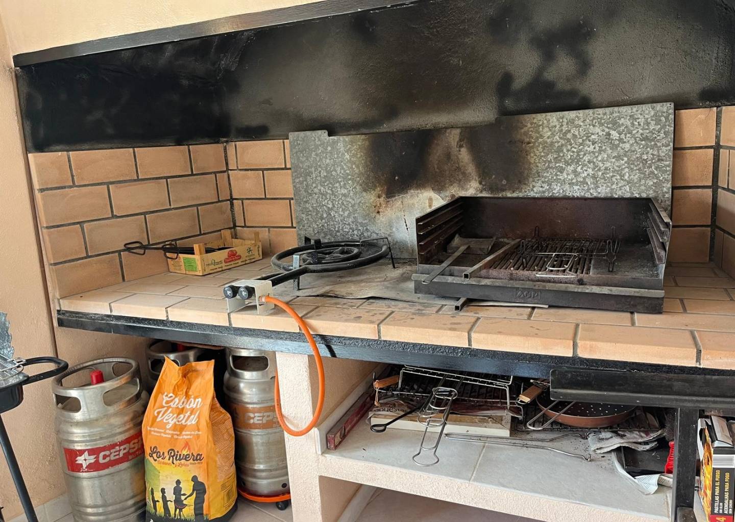Opposite the entrance is another smaller metal door which, when open, you can see the storage space for the pump and filter for the swimming pool and even more space for strong stuff. A little patio area with a table and chairs offers outside dining.