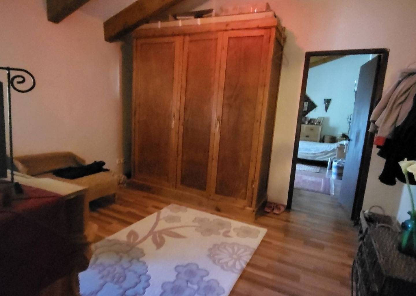 With over 300 m² of living space, the house welcomes you with an entrance hall, a bedroom on one side, and a bathroom on the other. Beyond the entrance hall, a cozy living-dining room with a wood-burning stove leads to a traditional kitchen. This includes a large pantry that once served as a stable and still retains its original features.