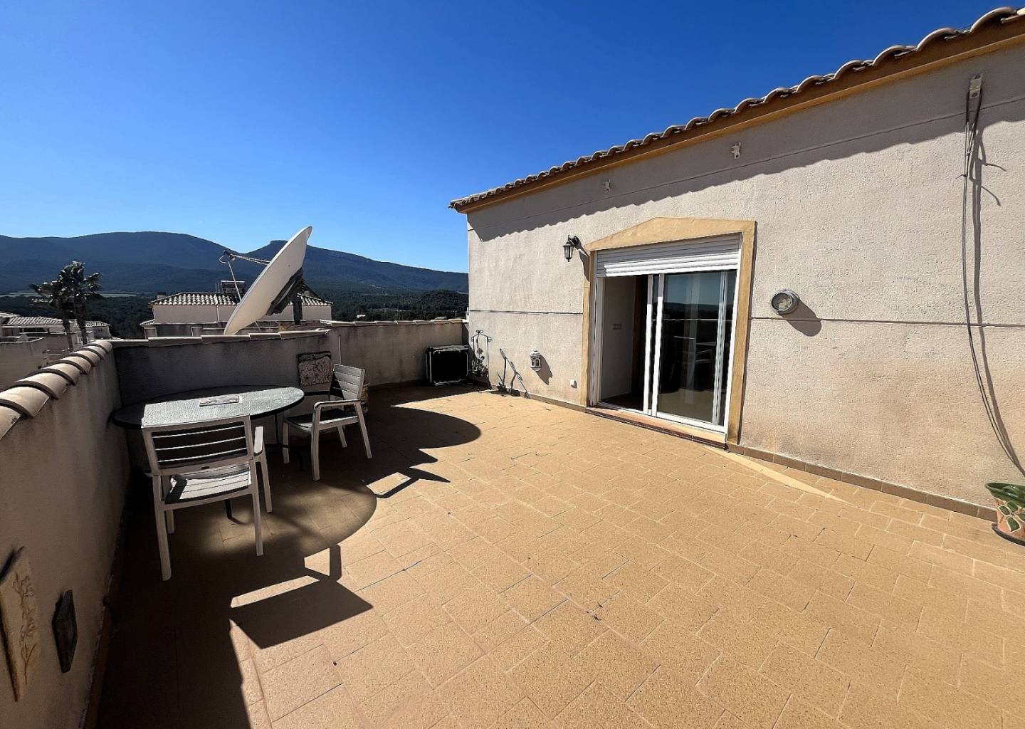Una impresionante escalera de mármol conduce desde el salón a la planta superior, donde encontrará un magnífico dormitorio adicional que podría funcionar como suite de invitados o segundo dormitorio principal. Esta habitación cuenta con amplios armarios empotrados y un espacioso baño privado con ducha. Sin embargo, lo más destacado son las puertas correderas que dan a una terraza privada con vistas espectaculares a las montañas y al paisaje circundante: un lugar perfecto para relajarse.